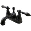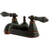 This bathroom faucet consists of elegant, traditional features and an early American style that befits an elegant design. This faucet has a double handle deck mount setup and features a 4" centerset arrangement. The body is fabricated from solid brass for durability and long-lasting use. The color finish is made of oil-rubbed bronze for dark, vintage shade, as well as resisting scratches, corrosion and tarnishing. The spout has a reach of 4-1/2" and a height of 2-7/8". The handles act as a 1/4-turn on/off water control mechanism for easy management of water volume and temperature. The faucet operates with a ceramic disc valve for droplet-free functionality with the water measured 2.2 GPM (8.3 LPM) and a 60 PSI maximum rate. An integrated removable aerator is inserted beneath the spout's head piece for conserving water flow. A pop-up drain in a matching finish is included. All mounting hardware is included and standard US plumbing connections are used. A 10-year limited warranty is provided to the original consumer.