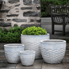 While the high firing temperature and quality of our glazed and terra cotta containers results in a durable and frost-resistant product, we still recommend that they be stored in a frost-free covered area in winter. If left outside, water may accumulate in the container and freeze, causing the planter to crack and break. Planters that must be left outside should be covered to prevent water, snow and ice from accumulating inside the planter.