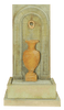 An arched alcove against square back wall with brick motif, the water pours into a waiting tall vase that spills over into the rectangular catch basin.