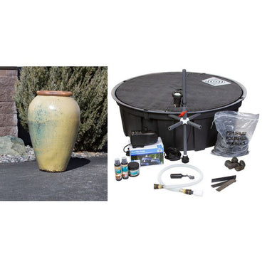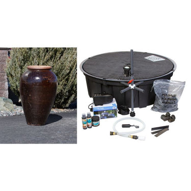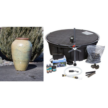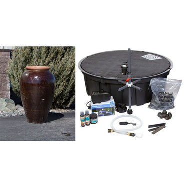 Fountain dimensions: 26"w x 41"h Fountain kit includes:• Exact vase shown in photo• 48" Achelous basin reservoir (48" diameter, 16" high)• 1110 gallon per hour mag-drive pump• LED light installed on standpipe• Necessary plumbing and flow control valve• Automatic water fill valve• Fountain water treatment kit• Splash apron• Five (5) bags polished pebbles Blue Thumb Fountain Vase Kits - 40572 It's a breeze to add the calming sounds of flowing water to your home or business landscape. The vases featured in the Blue Thumb collection are often naturally rustic but sometimes smooth with rich, vibrant colors. Craftsmen intentionally glaze each piece unevenly, creating subtle variations in color and texture that transform each fountain into a distinctive, original piece of art. Our vases are high-fired, robust, durable, and made to last, offering you years of enjoyment. You can rely on our fountain kits to come complete with everything you need to make installation easy. Average installation time varies from as little as a few hours for smaller fountains and up to 8 hours for larger or triple fountain kits- making these a great weekend project! Each kit includes: • The ceramic vase shown in the main picture above • Bulkhead fitting with standpipe assembly with flow control valve; pre-plumbed in vase • AquaBox fountain basin reservoir with a pre-plumbed automatic water fill valve • Efficient, submersible pump with 5 year warranty • Custom, kink-free tubing with quick disconnects for easy connection • Water treatments to keep the fountain looking great all year • Your color choice of polished pebbles to cover the AquaBox   We also offer other packages to enhance your enjoyment and alleviate maintenance tasks. Some of our most-popular options include: • LED light mounted on the standpipe inside the vase to light the plume of water. • Basin aprons help contain splash of taller fountains on windy days. Peaceful, elegant and timeless fountains bring auditory and visual beauty together to provide pleasure to everyone. Blue Thumb carries fountains that come in countless sizes, designs, materials, and colors. Our fountains enhance an array of spaces including gardens, entryways, & courtyards. What makes a Blue Thumb Vase so unique? When you work with Blue Thumb, you know your vase is high-fired, robust, and durable. We rely on a unique process in our facility to ensure that your fountain is easy to install and ready to provide you with years of beauty and enjoyment. 1. We work exclusively with high-quality manufacturers of ceramic products. Not every ceramic pot can be turned into a vase. Firing temperatures, ceramic thickness, and heating/cooling times determine whether a vase can withstand the constant pressure of water inside. We thoroughly clean and inspect each vase for imperfections or defects. 2. Each hand-glazed fountain vase in our collection has an individual character and is a distinctive, original piece of art. The rustic stoneware and glazed earthenware fountain vases featured in our collection were created from clay soils on pottery wheels or through the use of press molds. 3. Our AquaBox basin reservoirs are manufactured deeper than normal and are proudly made on our rotational molding machine in Saginaw, MI. 4. Our proprietary system simplifies connecting the vase and pump assembly. We drill and plumb each vase with a bulkhead fitting. Each vase comes with a standpipe assembly with flow-control ball valve. Utilizing a quick disconnect system and kink-free tubing, simply attach the quick disconnects to the underside of the vase as well as at the discharge of the pump and you are ready! 5. Blue Thumb fountains are patent protected by US Patent #7,341,203. There isn’t a more complete and professional-grade fountain system available on the market. The best part is we deliver right to your door, ready for installation!