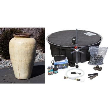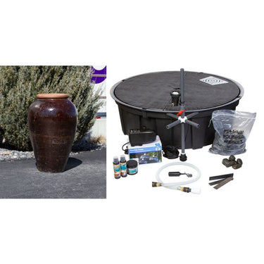 Fountain dimensions: 25"w x 56"h Fountain kit includes:• Exact vase shown in photo• 52" Altum basin reservoir (52.5" diameter, 20" high)• 1300 gallon per hour mag-drive pump• LED light installed on standpipe• Necessary plumbing and flow control valve• Automatic water fill valve• Fountain water treatment kit• Splash apron• Eight (8) bags polished pebbles Blue Thumb Fountain Vase Kits - 50331 It's a breeze to add the calming sounds of flowing water to your home or business landscape. The vases featured in the Blue Thumb collection are often naturally rustic but sometimes smooth with rich, vibrant colors. Craftsmen intentionally glaze each piece unevenly, creating subtle variations in color and texture that transform each fountain into a distinctive, original piece of art. Our vases are high-fired, robust, durable, and made to last, offering you years of enjoyment. You can rely on our fountain kits to come complete with everything you need to make installation easy. Average installation time varies from as little as a few hours for smaller fountains and up to 8 hours for larger or triple fountain kits- making these a great weekend project! Each kit includes: • The ceramic vase shown in the main picture above • Bulkhead fitting with standpipe assembly with flow control valve; pre-plumbed in vase • AquaBox fountain basin reservoir with a pre-plumbed automatic water fill valve • Efficient, submersible pump with 5 year warranty • Custom, kink-free tubing with quick disconnects for easy connection • Water treatments to keep the fountain looking great all year • Your color choice of polished pebbles to cover the AquaBox   We also offer other packages to enhance your enjoyment and alleviate maintenance tasks. Some of our most-popular options include: • LED light mounted on the standpipe inside the vase to light the plume of water. • Basin aprons help contain splash of taller fountains on windy days. Peaceful, elegant and timeless fountains bring auditory and visual beauty together to provide pleasure to everyone. Blue Thumb carries fountains that come in countless sizes, designs, materials, and colors. Our fountains enhance an array of spaces including gardens, entryways, & courtyards. What makes a Blue Thumb Vase so unique? When you work with Blue Thumb, you know your vase is high-fired, robust, and durable. We rely on a unique process in our facility to ensure that your fountain is easy to install and ready to provide you with years of beauty and enjoyment. 1. We work exclusively with high-quality manufacturers of ceramic products. Not every ceramic pot can be turned into a vase. Firing temperatures, ceramic thickness, and heating/cooling times determine whether a vase can withstand the constant pressure of water inside. We thoroughly clean and inspect each vase for imperfections or defects. 2. Each hand-glazed fountain vase in our collection has an individual character and is a distinctive, original piece of art. The rustic stoneware and glazed earthenware fountain vases featured in our collection were created from clay soils on pottery wheels or through the use of press molds. 3. Our AquaBox basin reservoirs are manufactured deeper than normal and are proudly made on our rotational molding machine in Saginaw, MI. 4. Our proprietary system simplifies connecting the vase and pump assembly. We drill and plumb each vase with a bulkhead fitting. Each vase comes with a standpipe assembly with flow-control ball valve. Utilizing a quick disconnect system and kink-free tubing, simply attach the quick disconnects to the underside of the vase as well as at the discharge of the pump and you are ready! 5. Blue Thumb fountains are patent protected by US Patent #7,341,203. There isn’t a more complete and professional-grade fountain system available on the market. The best part is we deliver right to your door, ready for installation!
