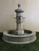 • Tiered fountain with egg finial, distressed surface, lion head motif, bulbous pedestals.