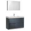 The Fresca Valencia Wall Hung Modern Bathroom Vanity with Medicine Cabinet comes with everything you need to create an elegant and modern bathroom. The rectangular vanity offers great storage with two soft-closing drawers and two soft-closing doors, just perfect for organizing all of your daily essentials. The drawers feature concealed aluminum handles and the cabinet has a stylish Glossy Dark Slate Gray finish. The white acrylic-resin countertop/sink has smooth lines and a thick profile. The sink is equipped with an overflow, single hole faucet mount and includes a solid brass faucet. This ensemble also comes with a fully mirrored 50” medicine cabinet with four adjustable glass shelves, to complete the look. This lovely vanity is available in multiple sizes and makes a stylish statement in any home.