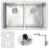 ANZZI presents the 32 in. VANGUARD SERIES hand crafted under mount kitchen sink. Representing the latest in modern home fixture designs and traditional European crafting technique this stunning display of artistry is hand shaped to perfection using RHINO ALLOY certified 16-Gauge 304 stainless steel. Only ANZZI hand crafted kitchen sinks utilize RHINO ALLOY certified materials for superior strength and quality. The cavernous 50/50 deep soaking dual basin will comfortably accommodate the largest dish loads including pots, pans and more. And every ANZZI sink features extra-large Echo-STOP sound dampening pads and a layer of protective composite coating to further quiet noise and prevent condensation. We have paired this sink with the ANZZI Harbour Kitchen Sink Faucet. Each ANZZI faucet has been certified as Water Sense approved with solid brass construction and valve included. Well defined diversion lines ensure quick and total water drainage and the subtly curved corners allow of easier cleaning. ANZZI carries a proud tradition of crafting long lasting, quality home fixtures. With ANZZI perfection is our tradition.
