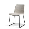 Simple lines are enhanced by neat channel stitching that adds comfort and style to this modern dining chair. Fully upholstered seat and back will allow you and guests to enjoy those long dinner parties. Unique leg design in black steel completes this ideal dining chair. Great modern touch around that long farmhouse table or perfect contemporary look when combined with a sleek glass table. This flexible design holds its own.