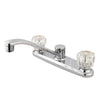 With traditional styling, the Water Saving Americana Centerset Kitchen Faucet looks great in almost all decorative styles. With twin acrylic handles, water temperature and volume is easily controlled. The spout reaches over 7 inches to give the user enough clearance from the sink. Faucet installs easily and is constructed from solid brass for durability and reliability. Faucet flows at a maximum of 1.5 gallons per minute for water savings.