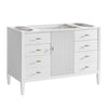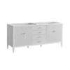 The 60" Myrrin Double Vanity features a minimalistic silhouette with fluted details, resulting in a blend of classical elegance and contemporary design. The deeply fluted panels run perpendicular on the doors and drawers, adding sophistication and visual interest to the design. Toggle-style knobs in Champagne Brass provide a luxe accent to the rich Bright White finish. The two-door cabinet opens to a spacious interior with a single shelf and a convenient USB/Electric power outlet. Two traditional drawers and a tip-out lend additional storage. Choose one of our tops with undermount, rectangular sinks to perfectly complete this masterpiece.