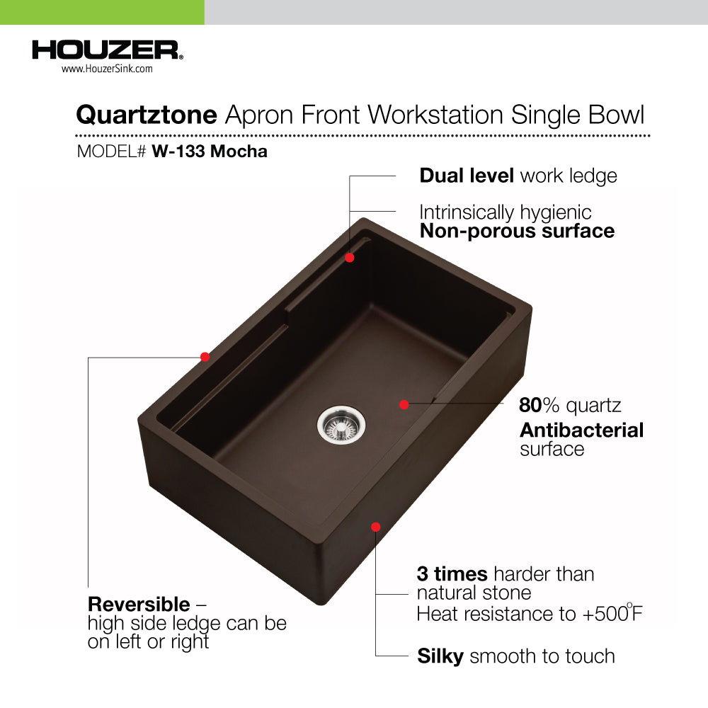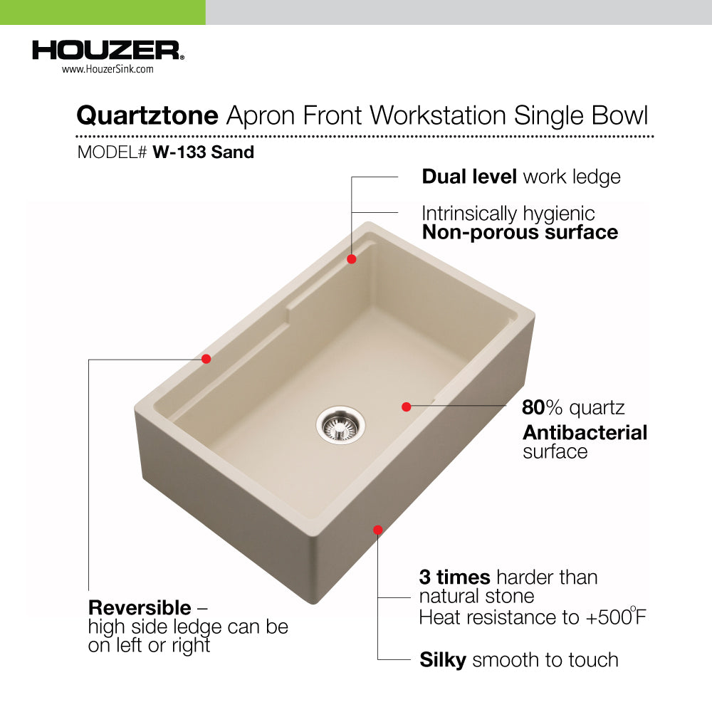 Bring exceptional durability and elevated design into your kitchen with the Houzer Quartztone W-133 33" Apron Front Farmhouse Workstation Sink. This granite composite sink blends timeless farmhouse charm with contemporary performance, featuring a spacious extra-large bowl crafted from a blend of 80% fine quartz sand and 20% high-grade acrylic. With integrated ledges for workstation accessories, it’s built for multitasking efficiency. Designed to meet the demands of passionate home cooks and entertainers, the W-133 is heat-resistant up to 500°F, UV-stable, and resistant to chips, fading, and scratches. The silky-smooth, non-porous surface provides intrinsic antibacterial protection, while a pre-scored deck allows for flexible faucet placement. Practical, hygienic, and visually striking, this sink transforms your kitchen into a functional centerpiece.