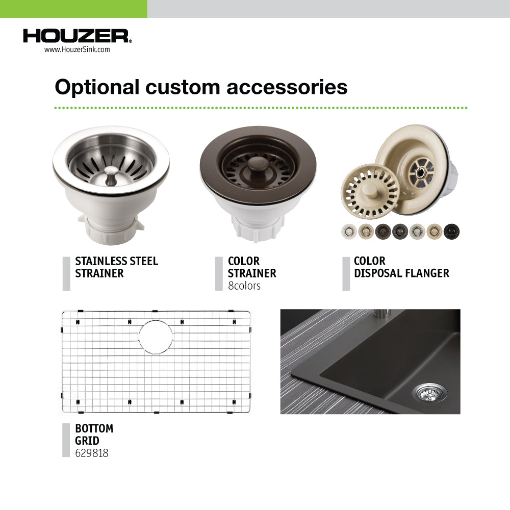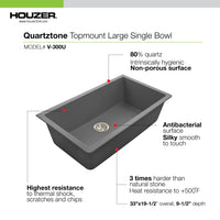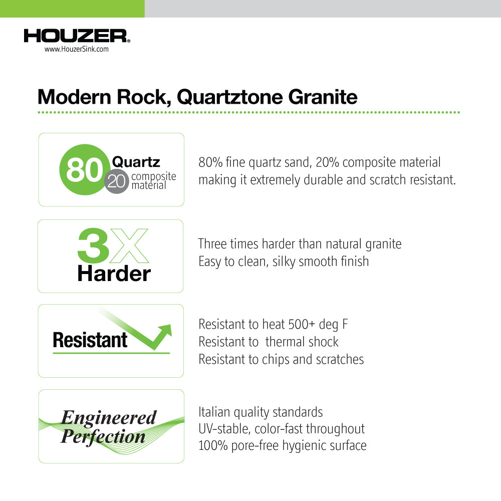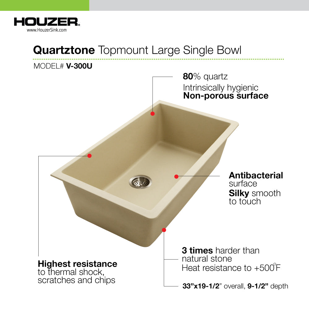 Redefine your kitchen’s style and function with the Houzer V-300U Quartztone 33" Granite Composite Undermount Sink. Designed for both everyday cooks and passionate entertainers, this extra-large single bowl sink delivers beauty, strength, and effortless maintenance. Constructed from a premium blend of 80% fine quartz sand and 20% high-grade acrylic, the Quartztone material is three times harder than natural granite and provides a luxurious silky-smooth surface. Its non-porous, food-safe construction resists stains, fading, and bacterial growth, while withstanding heat up to 500°F and extreme temperature fluctuations. Whether you're prepping, cleaning, or hosting, the V-300U offers the generous capacity and reliable performance you need—backed by Houzer’s Lifetime Limited Warranty.
