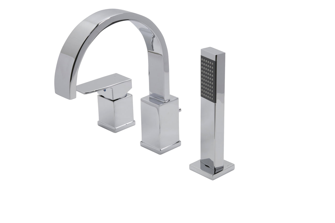 Three (3) Piece Widespread Deck-Mount Roman Faucet Set with Handheld Sprayer in Chrome Finish