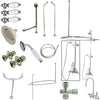 This clawfoot tub package includes faucet with high rise goose neck, hand shower and cradle, shower riser and shower head, curtain rod, chain plug drain and overflow, and supply lines all constructed of high quality brass to ensure reliability and durability. The premier finish resists tarnishing and corrosion. All mounting hardware is included and standard US plumbing connections are used.
