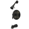 The Kingston Brass Water Saving Metropolitan Tub and Shower Faucet is fitting in almost any home décor style. This faucet system is constructed from solid brass for outstanding durability and reliability. The tub and shower faucet features a pressure balanced valve to preventing unwanted spikes in temperature. The showerhead meets the EPA's WaterSense program saving you water flowing at a rate of 1.5 gallons per minute. The single lever handle easily turns to being water flow. This faucet installs on standard US plumbing connections.