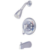 The Kingston Brass Water Saving Chatham Shower Faucet provides exceptional value and quality. Constructed from solid brass, this tub and shower system includes everything needed for a new installation or a remodeling project. The faucet system features a pressure balanced valve to prevent any unwanted spikes or drops in temperature. Water is controlled through a single lever handle. The showerhead features a 1.5 gallon per minute flow rate meeting the EPA's WaterSense program requirements. System installs on standard US plumbing connections.