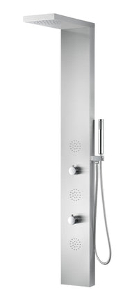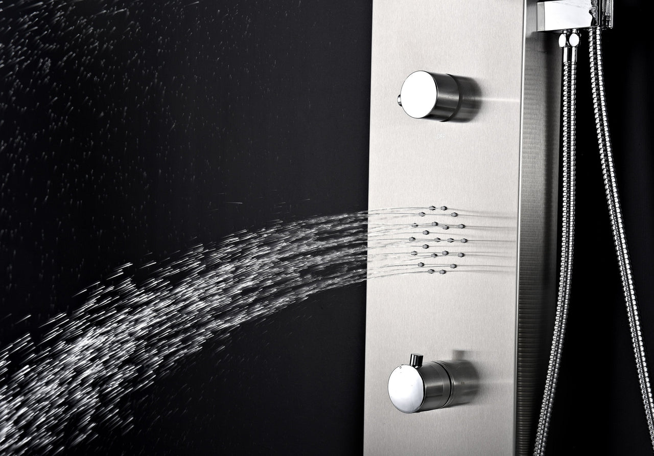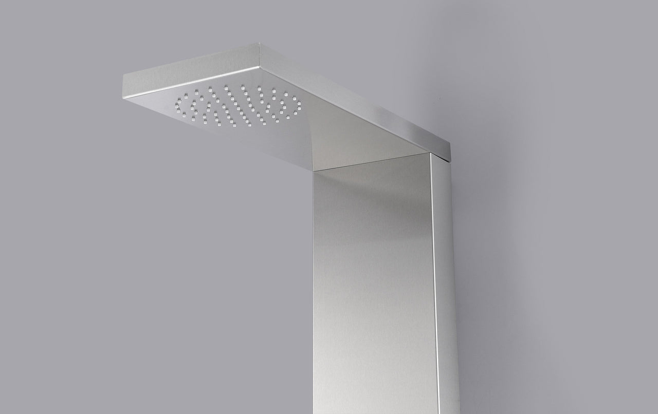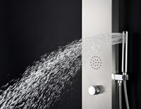 The ANZZI full body TUNDRA shower panel features a modern laser cut brushed 304 stainless steel body with 3 Acu-Stream body jets providing a relaxing yet powerful water stream to massage the body. The Heavy Rain shower head hangs overhead releasing a steady torrent of soothing water from above. And always positioned at the column’s flank is the Euro-Grip hand held sprayer with free reign reach of up to 60 inches. And everything is controlled through 2 chrome thermostatic and diverter controls.