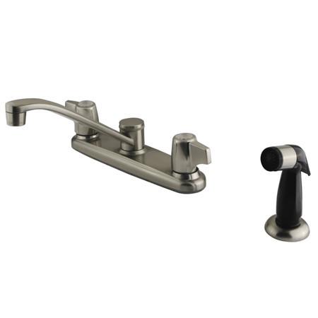 Upgrade your home kitchen faucet with the Kingston Brass Water Saving Magellan Centerset Kitchen Faucet with side sprayer. This kitchen faucet features solid brass construction for outstanding durability and reliability. The spout on the faucet reaches out over 7 inches with a spout height of 4.5 inches giving the user plenty of space between the spout and sink bottom. The faucet also features a low flow 1.5 gallons per minute to meet the EPA's WaterSense criteria. This kitchen faucet installs on a 8 inch centerset installation with standard US plumbing connections.